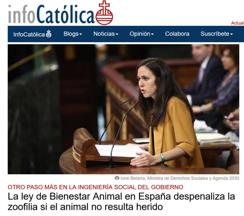 Я когда заголовок увидел, то подумал, что это такая дурная шутка - "Belarra despenaliza la zoofilia si no produce lesiones al animal" (Беларра декриминализирует скотоложство, если оно не причиняет вреда животному). Но пошел читать - нет, в самом деле: эти прекрасные люди предложили такие формулировки нового "Закона о защите животных" (Ley de Bienestar Animal), который по сути декриминализирует зоофилию.