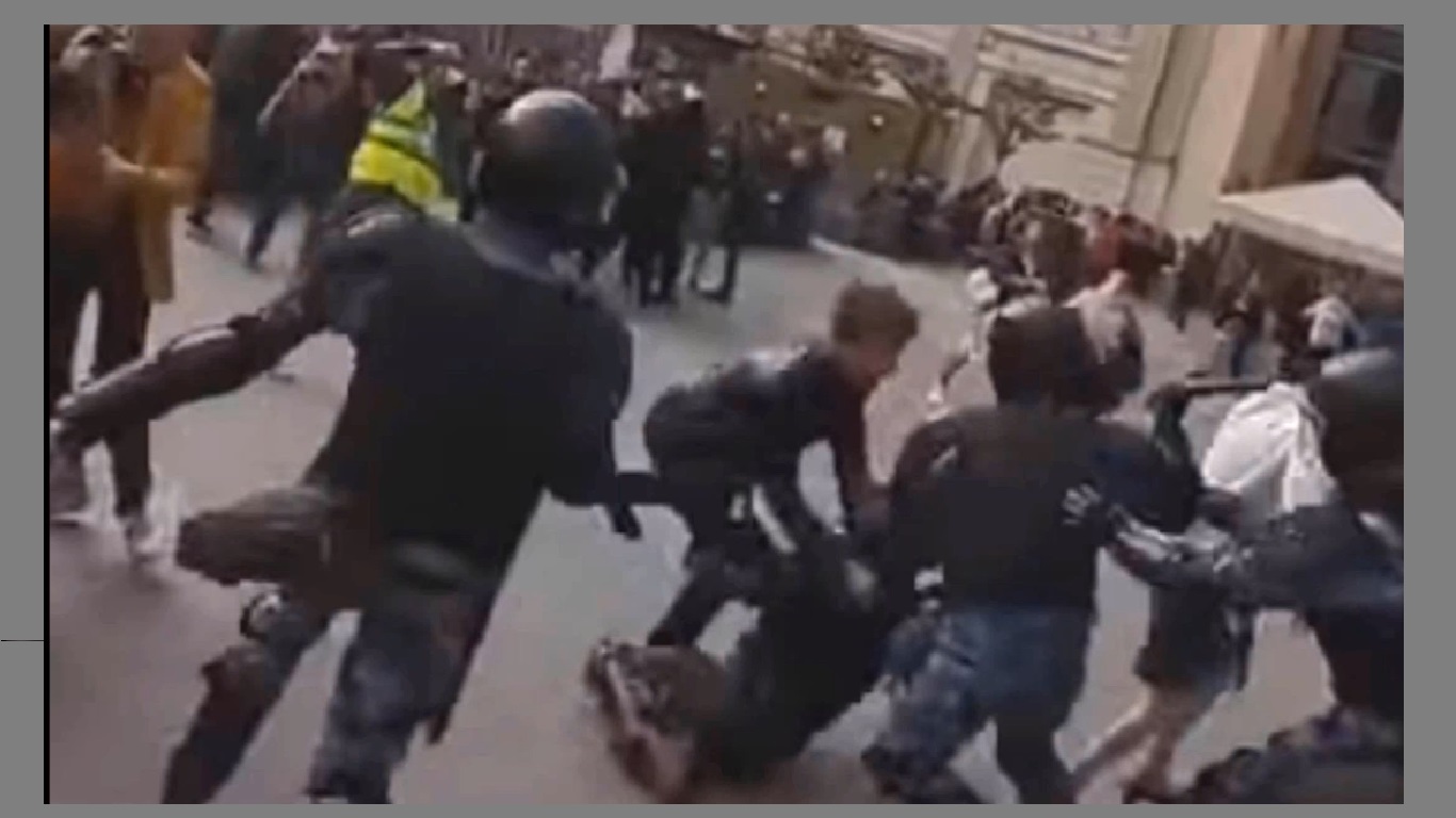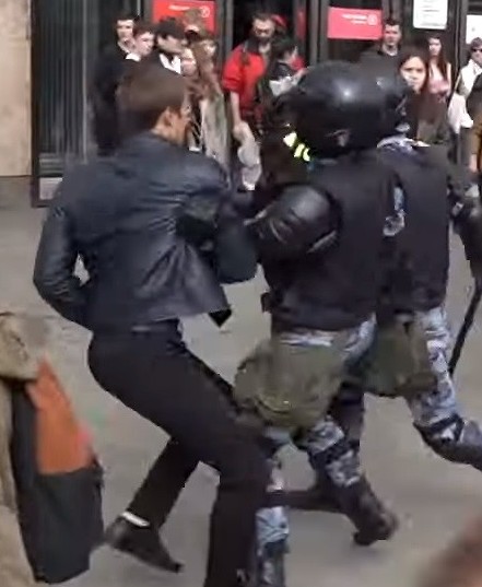 Что видим мы? Задерживаемый чувак ни от кого не скрывается, а мирно стоит с телефоном на улице среди сотен других прохожих. С разбегу на него набрасывается стая бронированных машин для избиения, без малейших разговоров или предъявлений - не задерживает или арестовывает, а валит, избивает и утаскивает. В теории такое может произойти, если только подозреваемый - кто-то вроде бен Ладена и вот-вот нажмет на кнопку детонатора, медлить нельзя ни секунды. На практике же - см. начало текста. Разговоры про его сопротивление в кадре смешны: он в лучшем случае успевает рефлекторно отпрыгнуть, любой отпрыгнет - мало ли кто на тебя тут лезет толпой с палками.