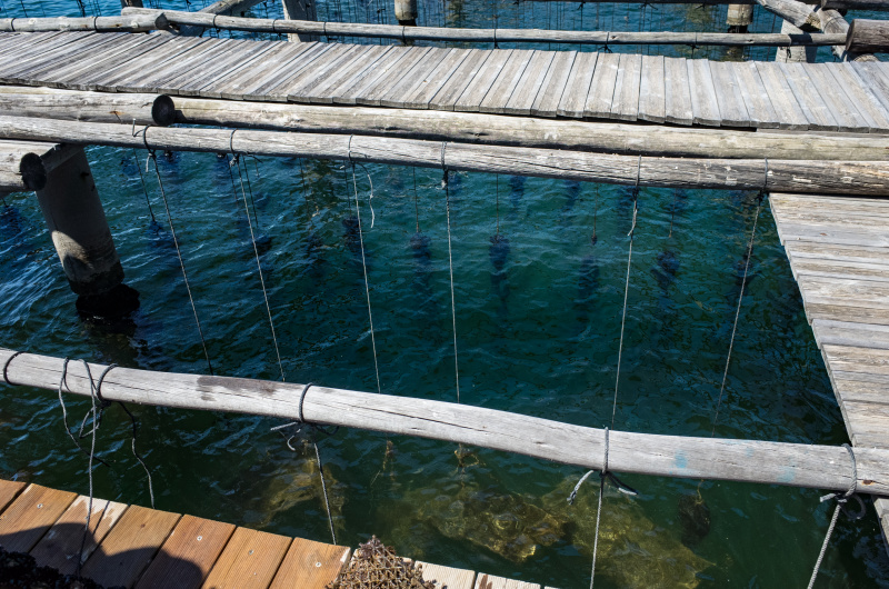 А вот сами фермы. Из-за окружающей залив косы глубина тут минимальная: фактически самое глубокое место - метра полтора-два. Почти весь залив можно пройти, плавать в нем необязательно. Ну и, соответственно, фермы монтировать вполне удобно.