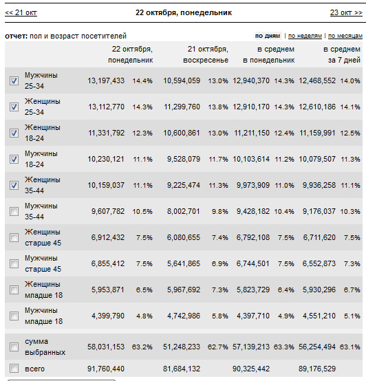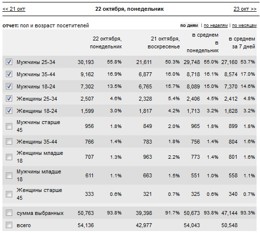 Ну и очень интересно сравнить данные по моему проекту с общими данными по Рунету - вот за то же 22 октября. Очень хорошо видно, что процентное соотношение мужчин и женщин в Рунете - примерно одинаковое.