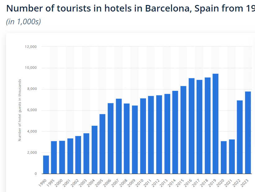 4. После ковидной паузы количество туристов в Барселоне растет со страшной силой: в этом году цифры за первый триместр уже на 19% опережают прошлый год и на 11% - золотой доковидный 2019-й.
