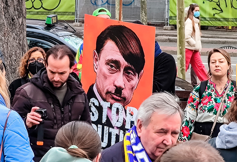 Вот этот портрет можно видеть на улицах Барселоны практически каждый день, начиная с 24 февраля. Путин - это новый Гитлер, именно так его воспринимают в большинстве цивилизованных стран.