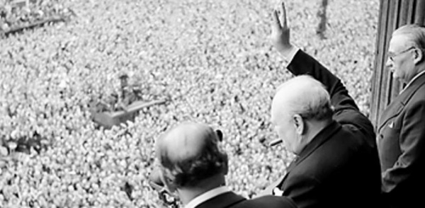 Уинстон Черчилль машет рукой толпе, собравшейся на празднование победы в Европе 8 мая 1945 года.