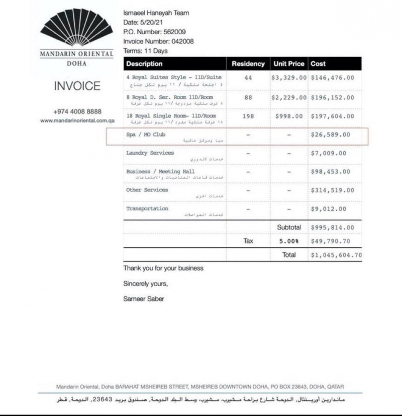 Делегация "ХАМАС" приехала в Катар обсудить перемирие в Секторе Газа. Пятизвездочный отель Mandarin Oriental. За 11 дней нагуляли более чем на миллион. Рестораны и бары - $315,5 тысяч, СПА - $26,5 тысяч.