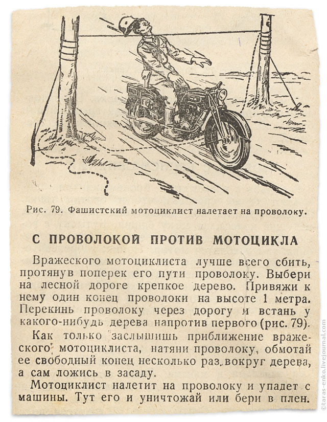 Мотоциклист во время движения почувствовал, как ему что-то врезается в шею, и сумел быстро остановиться. Он увидел леску, натянутую поперек дороги. К счастью, для него дело окончилось небольшим порезом. Была бы скорость больше, дело могло окончиться смертью или очень серьезными травмами.