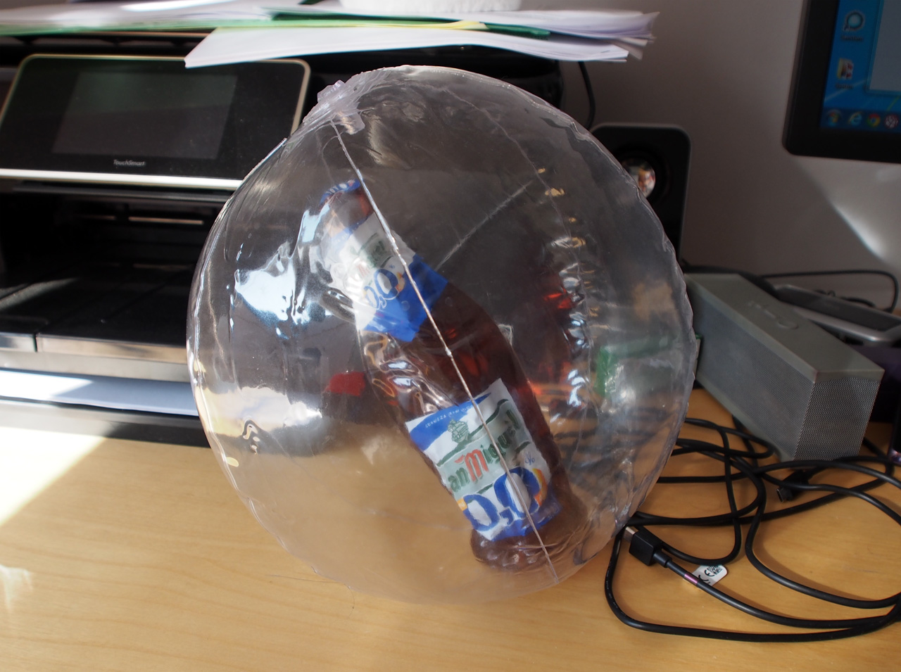 Ребенок попросил купить ему небольшой надувной мячик. Ну, купил. Надул, а там внутри мячика - надувная бутылка пива San Miguel (популярная местная марка). Ничего себе, думаю я, детей с детства к алкоголю приучают, почему молчит местный Онищенко?!!
