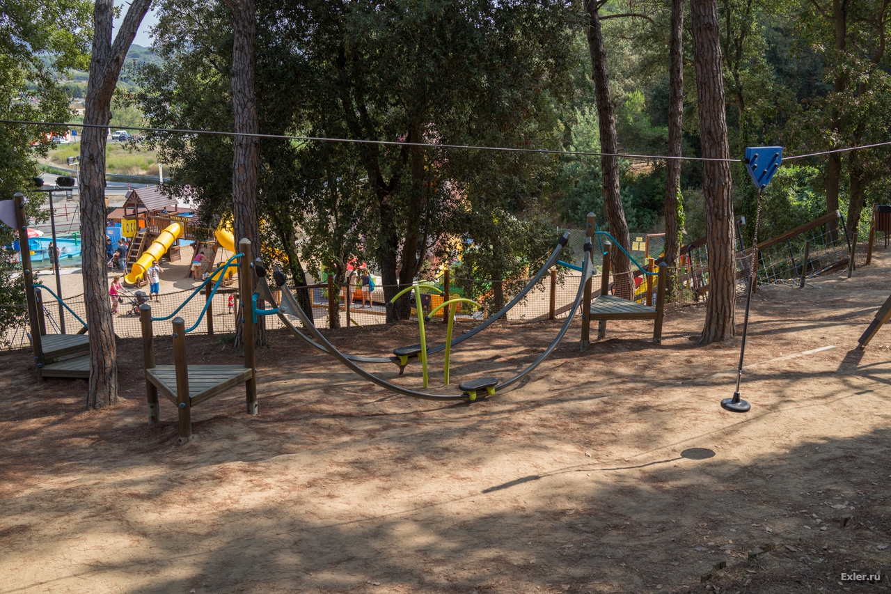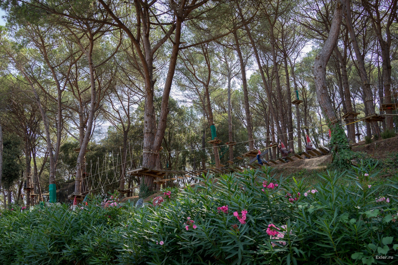 Лесные тренажеры для детей постарше. Их учат пристегиваться страховкой и преодолевать препятствия.