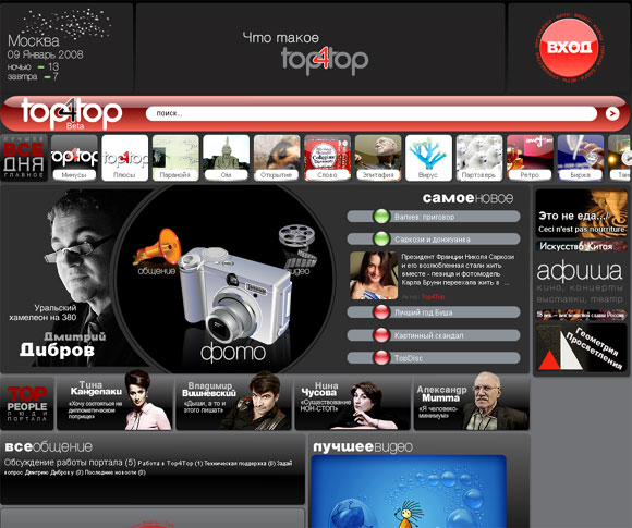 Как уже неоднократно предупреждали в Средствах Мозгового Изнасилования, несколько шоу-деятелей шоу-бизнеса, которые, разумеется, прекрасно знают, как именно нужно делать проекты в Интернете, забубенили супер-экстра-мега-портал Топфотоп (top4top). На него, как они гордо заявили, будет потрачено 15 миллионов долларов. Сколько потратили уже - не сообщается. Надеюсь, что много. Выглядит это явление следующим образом (не все в этом смогут убедиться, так как все выполнено на флеше).