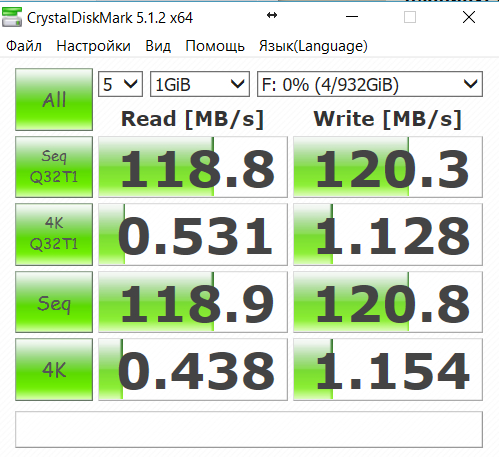 При подключении к ПК кабелем работает как обычный внешний жесткий диск. Вот характеристики скоростей чтения-записи в различных режимах.