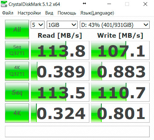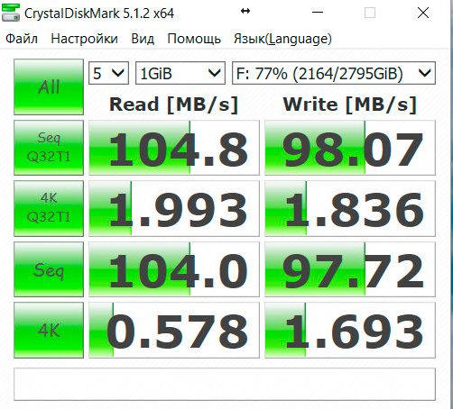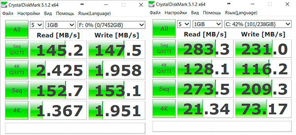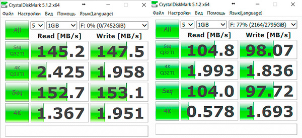 Все тесты проводились по CrystalDiskMark 5.1.2.