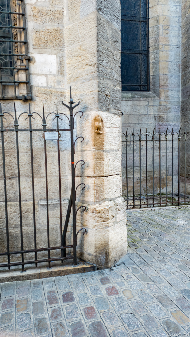 А это знаменитая дижонская сова, символ города. Специальным треугольным значком совы в Дижоне отмечаются достопримечательности. Эта сова исполняет желания: нужно загадать желание и дотронуться до совы. Правда, знатоки говорят, что не все так просто, и что там сначала нужно найти василиска, чтобы он не уничтожил желание, потом подпрыгнуть, высунуть язык, произнести заклинание "Дижон-джон-джон-пол-ринго", и только после этого дотрагиваться до совы - мол, только так сработает.