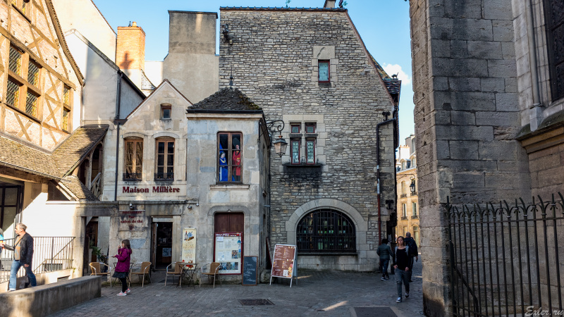 Кафешка в старинном здании рядом с совой, слева от нее находится магазин со знаменитой дижонской горчицей.