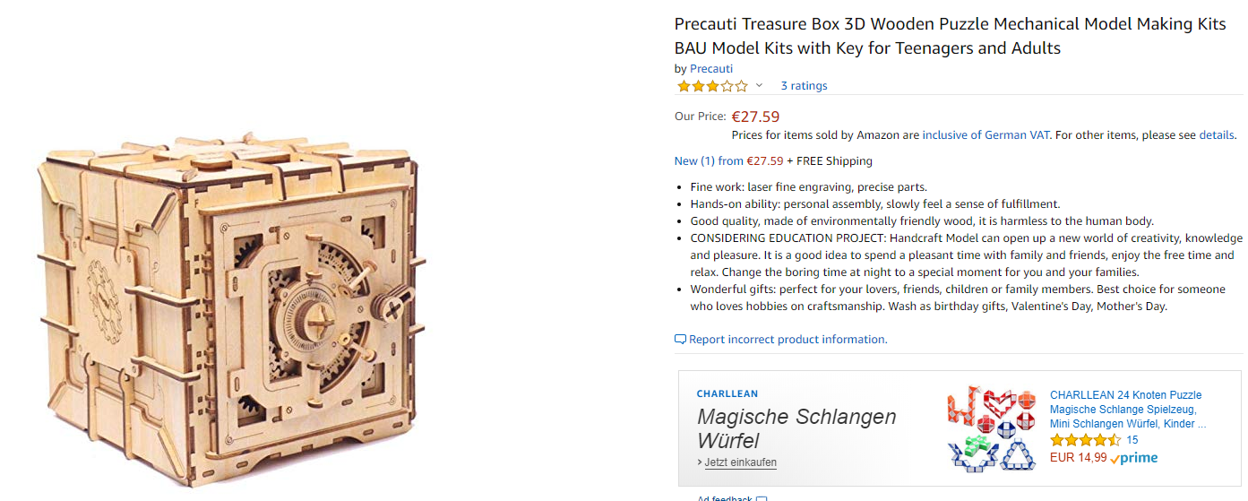 Ну и тем, кому понравится сейф, наверняка оценят изящную "Шкатулку с секретом". 190 деталей, закрывается на ключ, работу механизма открывания можно видеть через прорези. 3490 рублей, с промокодом - 2094 рубля.