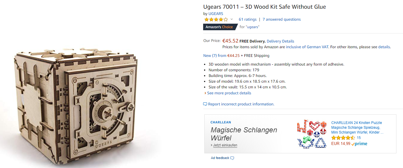 Наш с сыном любимец, пользующийся неизменной популярностью - "Сейф". Это был первый сложный конструктор Ugears, который мы собрали. 170 деталей, работающий кодовый замок, стопроцентная функциональность: младший Экслер до сих пор в нем что-то хранит и хвастается сейфом перед своими гостями.