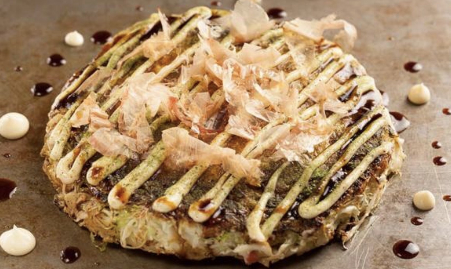Это классная и прикольная вещь, типа японского омлета-лепешки из капусты и прочего, попробовать стоит (если не бояться майонеза 😄).
