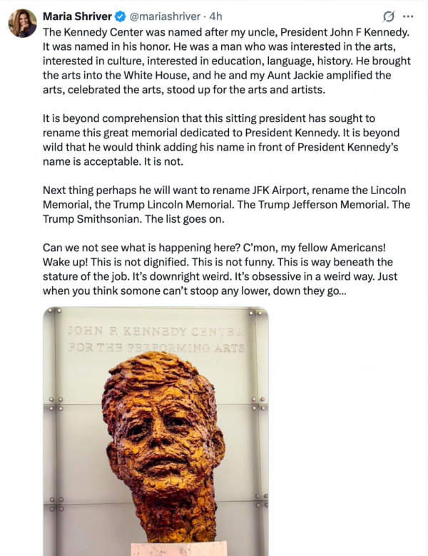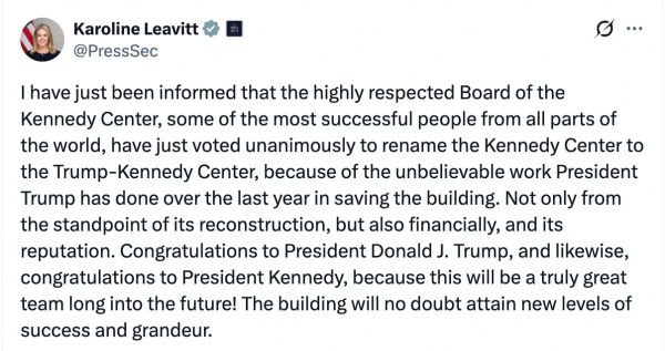 Только что мне сообщили, что уважаемый совет директоров Кеннеди-центра, в который входят некоторые из самых успешных людей со всего мира, только что единогласно проголосовал за переименование Кеннеди-центра в Трамп-Кеннеди-центр в связи с невероятной работой, проделанной президентом Трампом за последний год по спасению здания. Не только с точки зрения его реконструкции, но и с финансовой точки зрения, а также с точки зрения его репутации. Поздравляю президента Дональда Дж. Трампа, а также поздравляю президента Кеннеди, потому что это будет действительно великолепная команда на долгие годы! Здание, без сомнения, достигнет новых высот успеха и величия.