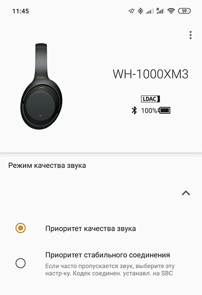 Но Вильянов докопался, как это исправить! Оказывается, виновата программа Sony Headset Connect. В ней просто нужно выставить приоритет качества звука, а не стабильности соединения, после чего соединяется уже по протоколу LDAC и качество звука становится совершенно шикарным, унитазы отдыхают.