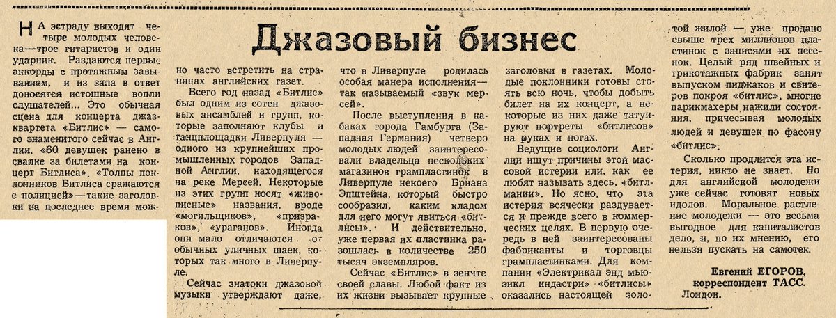 В FB попалась заметочка. В советские времена я ее не читал. Вообще интересно, чем этим убогим The Beatles-то не угодили? Тогда были и всякие панк-группы, на которых можно было оттянуться в стиле возмущенного соцреализма. А уж "Битлс"... А-а-а-а, понял, больше всего прически возмущают. Прически, недостойные советского человека!