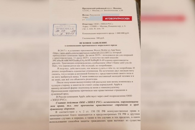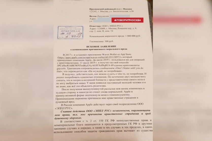 В редакцию Говорит Москва попало необычное письмо: иск к Apple от москвича Разумилова Д.Е., который требует компенсацию в миллион рублей за «доведение до гомосексуализма».