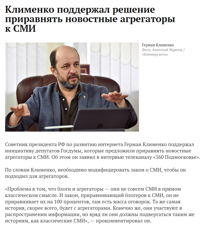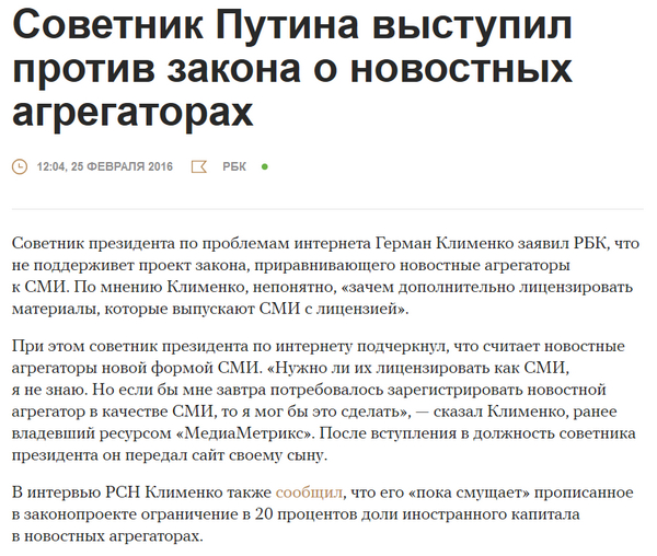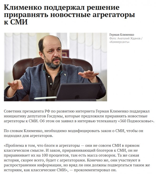Жду заметки "Клименко не стал комментировать закон о новостных агрегаторах"...