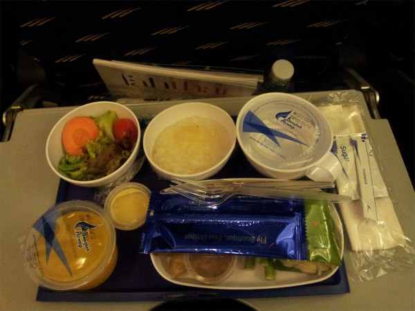 Полет там продолжается меньше часа, однако при этом кормят. И с самолетной едой уже началась местная экзотика - например, две колбаски из длинной упаковки были очень острыми даже без еще более острого соуса, который к ним прилагался.