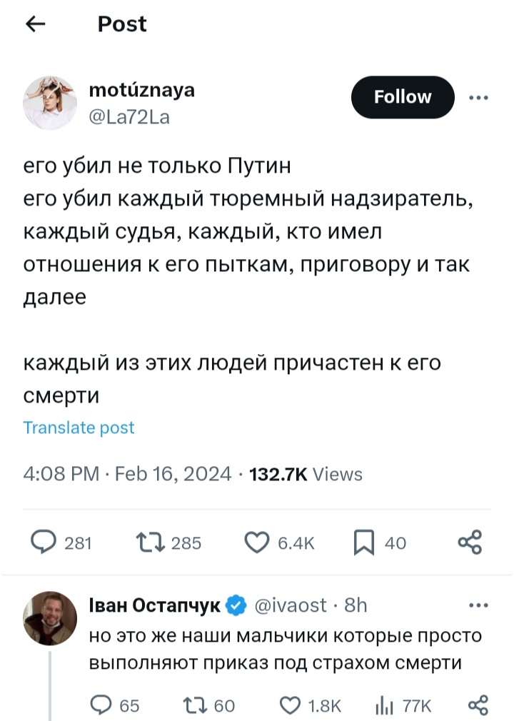 Не менее возмутительно ведут себя казахи. Один из них посмел дать в Х пост twitter.com с текстом "Пожалуйста, не носите цветы памяти Навальному к памятникам жертв репрессий в Центральной Азии. Это неуважение к людям, которых он сравнивал с тараканами. Горюйте у себя дома, спасибо."