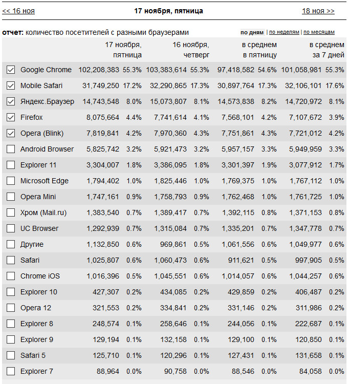 Мне кажется, нагляднее смотреть не по версиям (где в итоге треть other), а просто по браузерам www.netmarketshare.com/browser-market-share.aspx