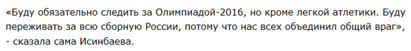 А что там не допустили саму Исинбаеву - так я даже понятия не имею, кто это такая: легкоатлетка, тяжелоатлетка или вовсе не атлетка.