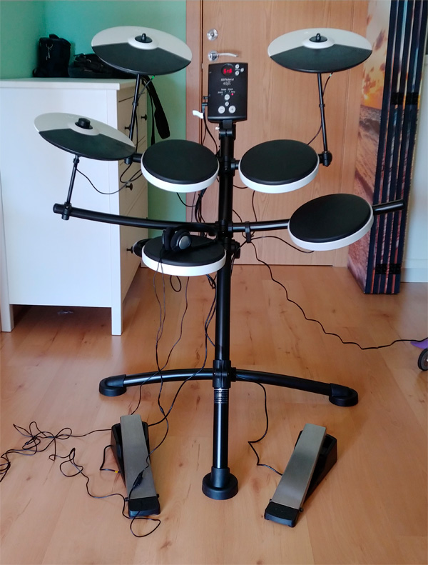 Врт я самый простой и относительно дешевый Roland и взял. Установка выглядит как игрушечная, но при этом вполне полноценная бесшумная ударная установка. Есть компьютер с четырьмя режимами (барабаны, темп, обучение, мелодии) и метрономом - в общем, все, как полагается. Звучит нормально, монтируется и демонтируется за пять минут, легко переносится с этажа на этаж. Ну и если будет охота, то к ней еще можно подкупить барабанчиков, тарелочек и так далее. И как раз у меня в загашниках валялись наушники с длинным шнуром - пригодились.