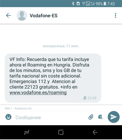Как же приятно видеть такие сообщения, когда куда-нибудь прилетаешь. Испанский Vodafone напоминает, что я в Венгрии могу наплевать на роуминг и пользоваться своим обычным домашним тарифом на звонки, SMS и Интернет. Это действует и на всей территории ЕС, и даже в Штатах и Латинской Америке.
