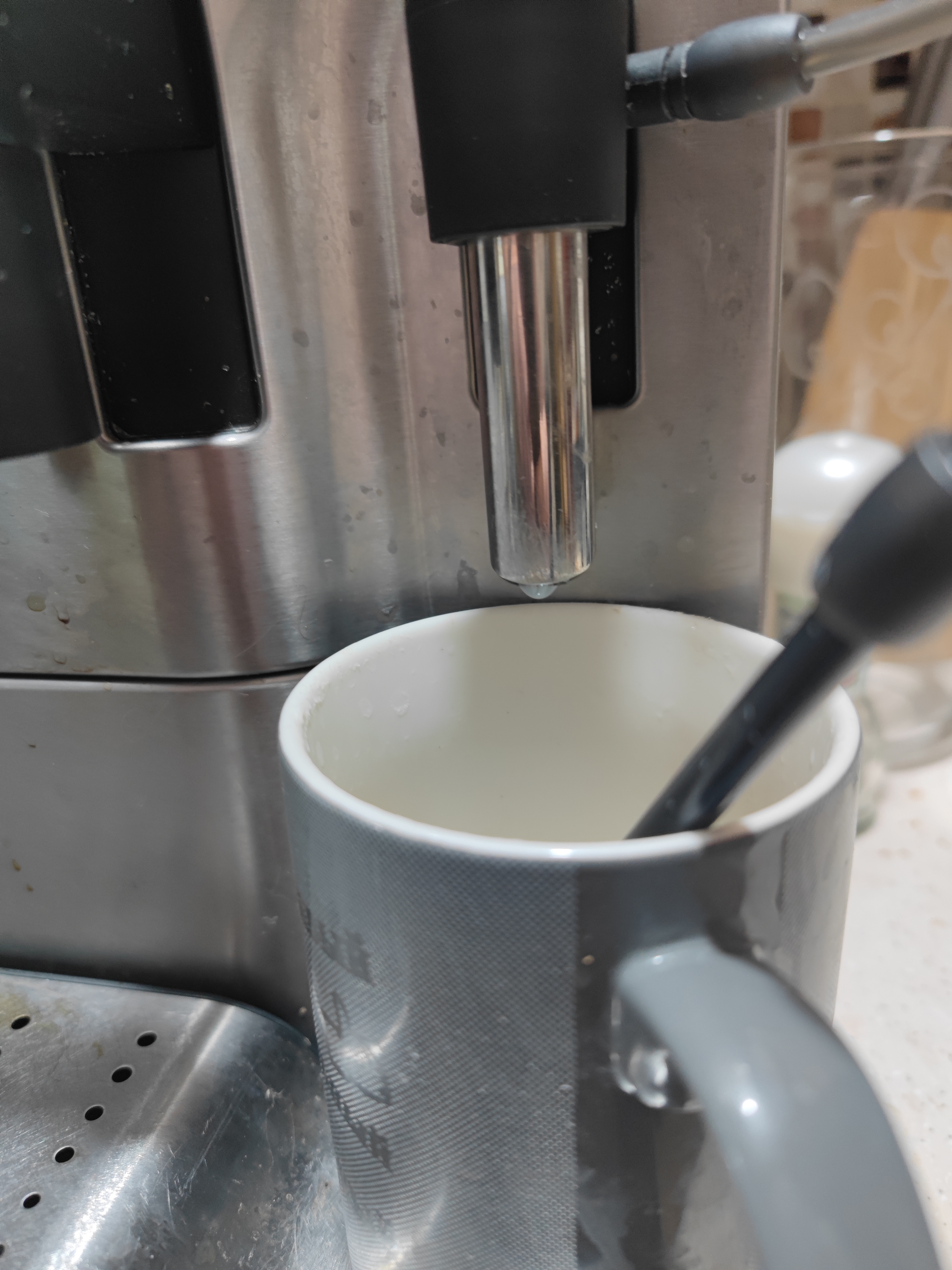 - поставил на стол все компоненты машины в правильном порядке включая чашку для эспрессо и большую чашку для разогрева