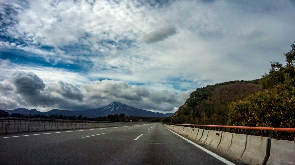 Постепенно забираешься повыше и уже видны горы с заснеженными вершинами.