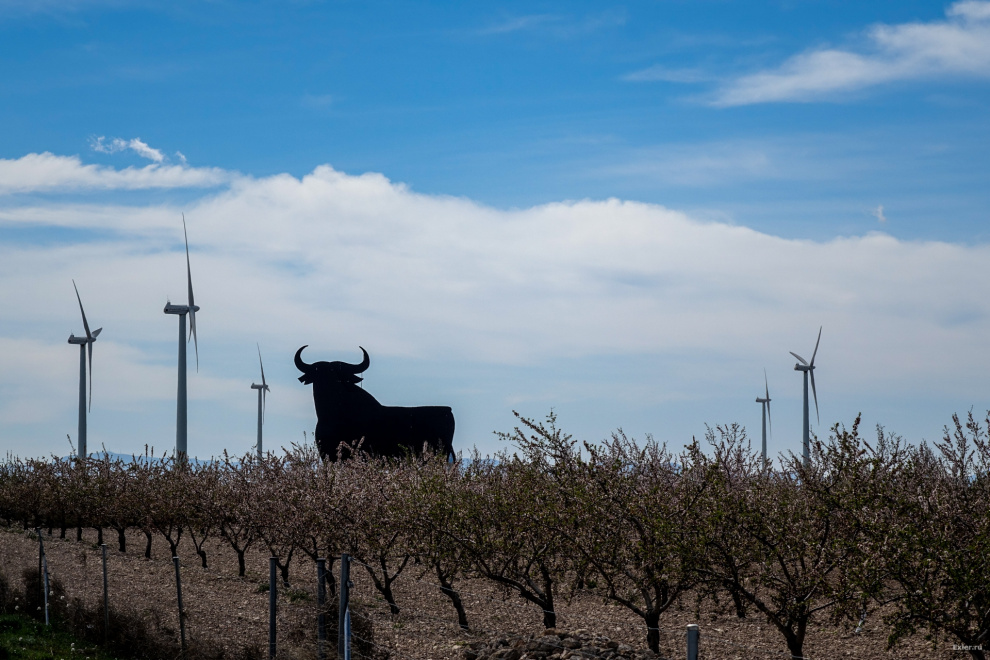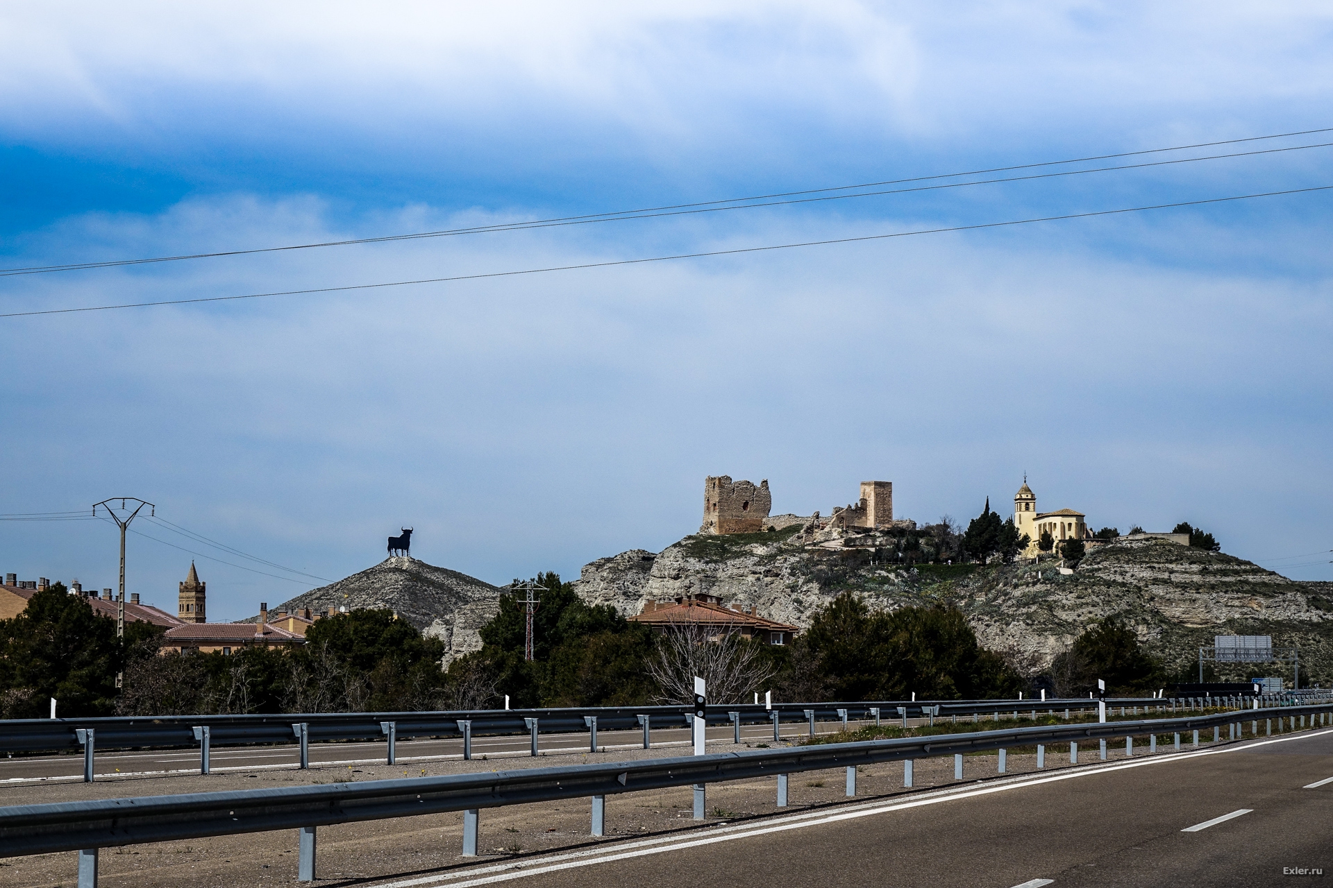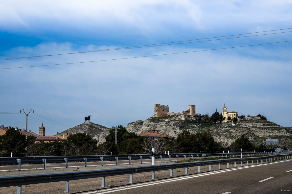 Где-то после выезда из Каталунии в Арагон - стали появляться фигуры бычков, символы Испании. Рассказывают, что изначально их изготовили в качестве рекламы какого-то напитка, но фигуры так понравились испанцам, что о напитке давно забыли, а фигуры бычков так и стоят. Вот один из первых (слева снизу на снимке) по дороге на Мадрид. Он гордо стоит на холме и виден издалека. (Все фото кликабельны, как обычно.)