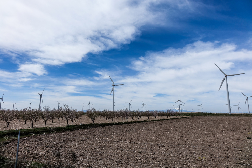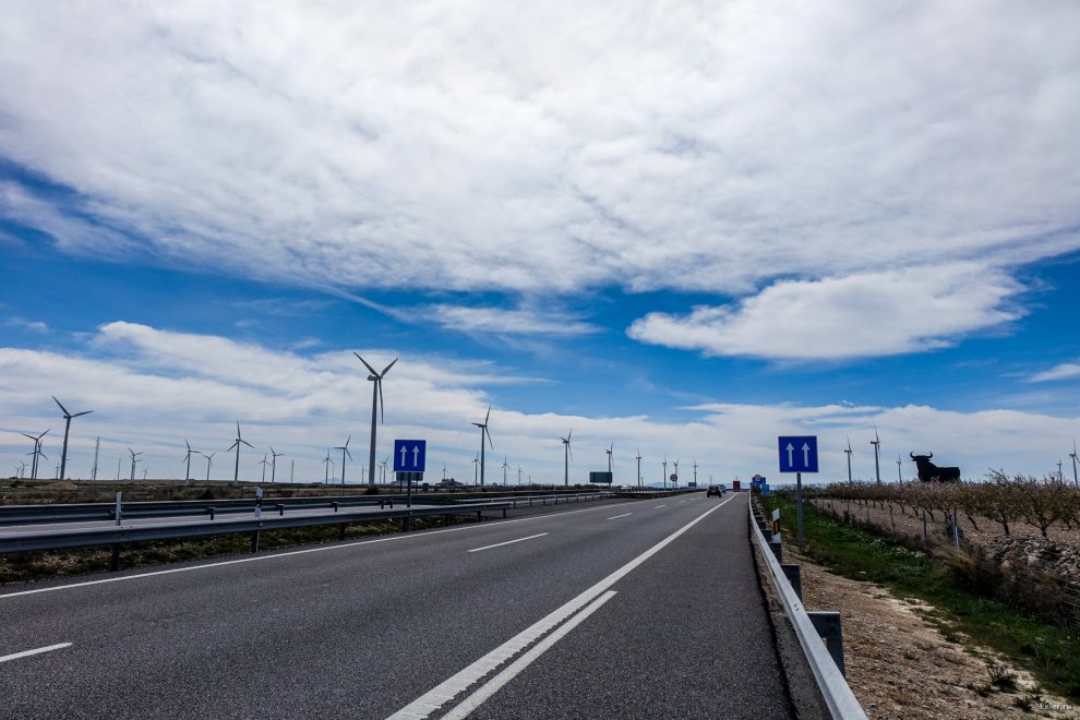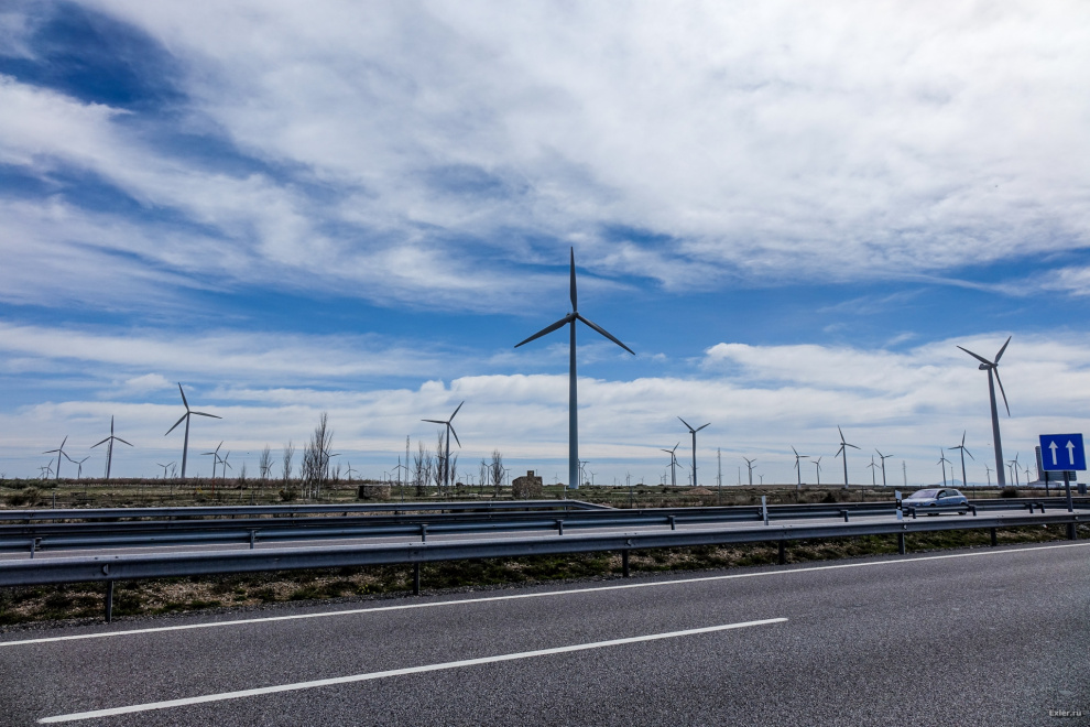 По дороге от Сарагосы в Мадрид - много долин, хорошо продуваемых ветрами, и там полно ветряков. Есть целые долины ветряков - вот одна из них.