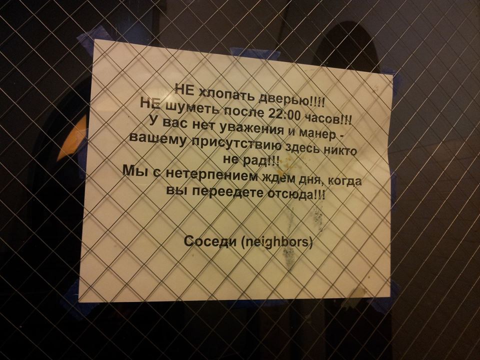 Дык, может быть, это не какие-то там абстрактные американцы написали для каких-то абстрактных русских соседей, а это сам Экслер на своей двери такую объяву нашёл и сфоткал? 😄