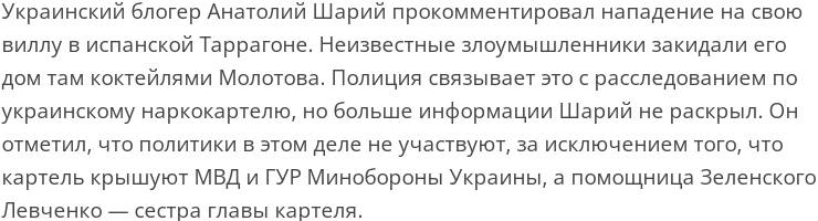 Как известно пророссийский блогер украинского происхождения Анатолий Шарий последние три года живет в Испании в районе Рода-де-Бера, Таррагона. Сегодня утром (в ночь с 23 на 24 октября) его дом забросали коктейлями Молотова.