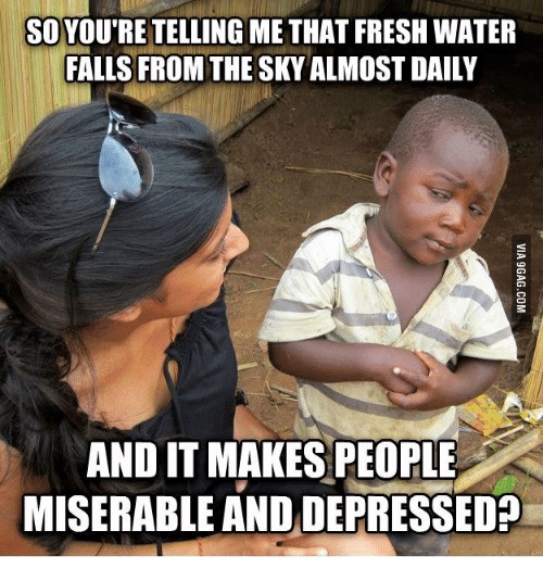 В местной группе, как обычно в подобных крайне редких случаях (тут чтобы весь день лил дождь - такое бывает раза две-три в год), начинаются конкретные истерики: "Что происходит? Это Апокалипсис!", "У меня депрессия", "Когда это всё закончится?!!" и так далее.