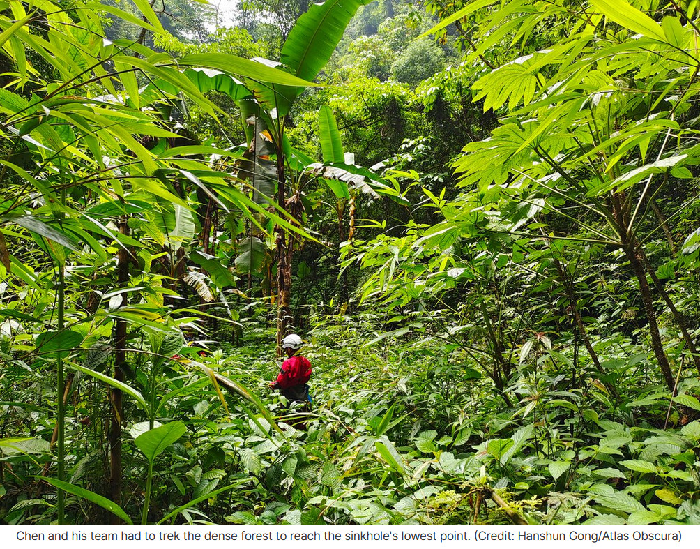 Лисинь Чен, основатель Клуба экспедиций в пещеру Гуанси 702, и его команда впервые спустились в огромную пропасть 6 мая 2022 года. Им не потребовалось много времени, чтобы добраться до твердой земли. Но вскоре группа поняла, что они и близко не подошли к дну воронки глубиной 630 футов. Им пришлось пройти через густой подлесок из пышных зеленых лиан и деревьев высотой до 130 футов в течение нескольких часов, чтобы добраться туда.