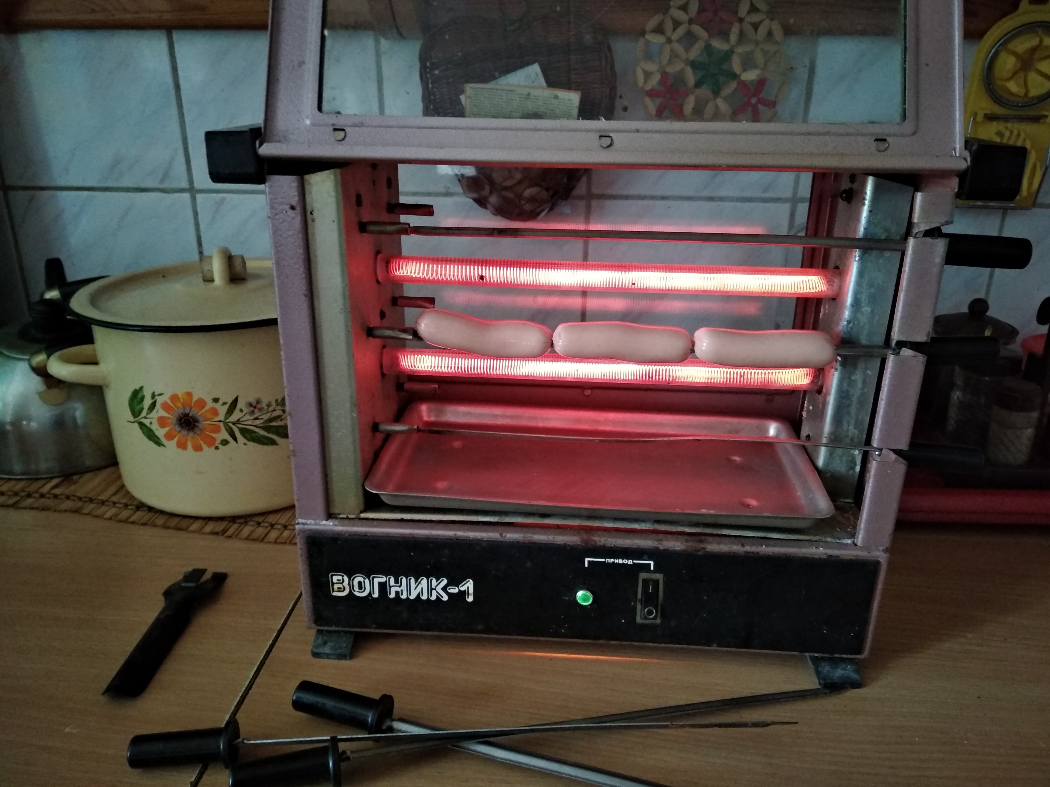 У нас ещё когда-то была электрошашлычница вообще в виде мангала (открытый сверху металлический короб со спиралями на дне) – это был ещё более лютый бред сумрачного советского гения... ?