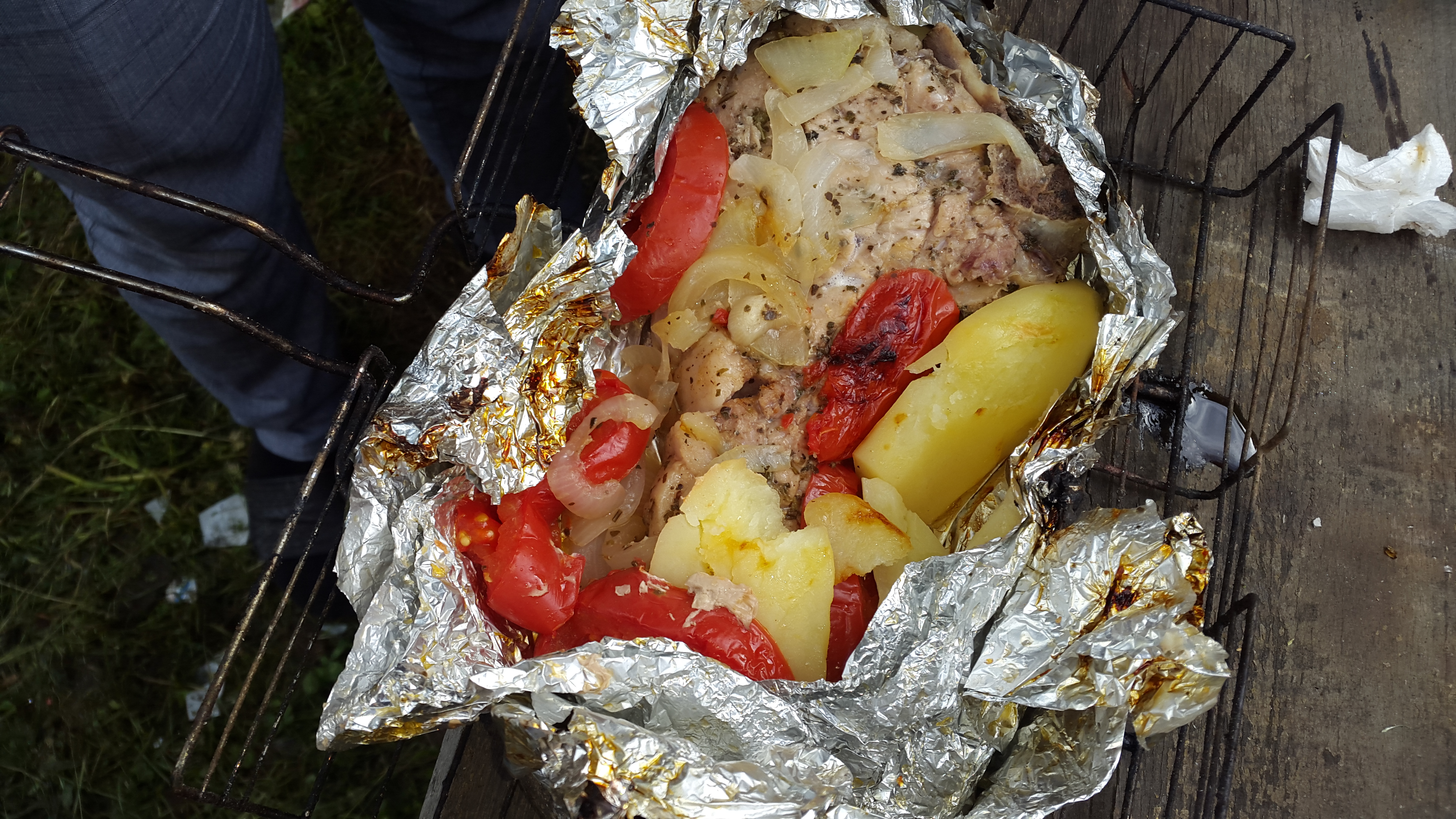 Через двадцать минут друг положил на гриль свое новое фирменное блюдо: молодая картошка нанизывается на шампуры, прокладывается кусочками свиной грудинки и кусочками красного перца, после чего заворачивается в фольгу - и на сорок минут на гриль, не забывая периодически поворачивать шампуры.
