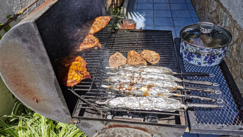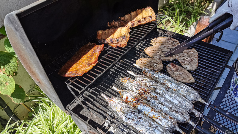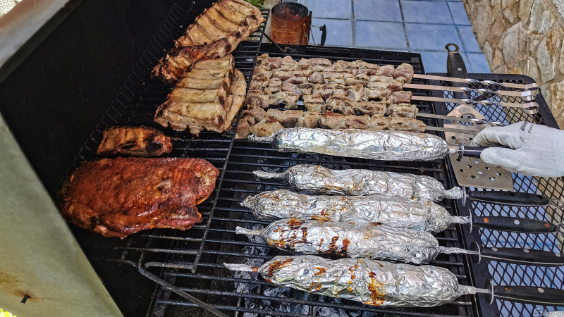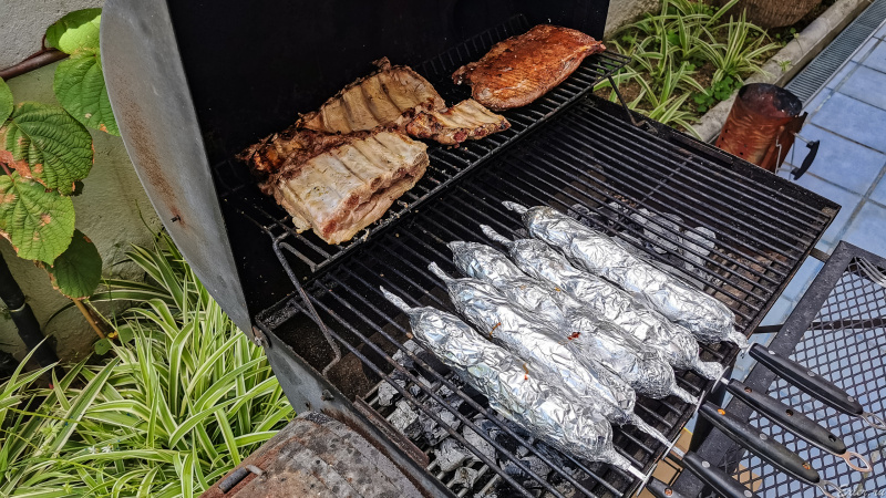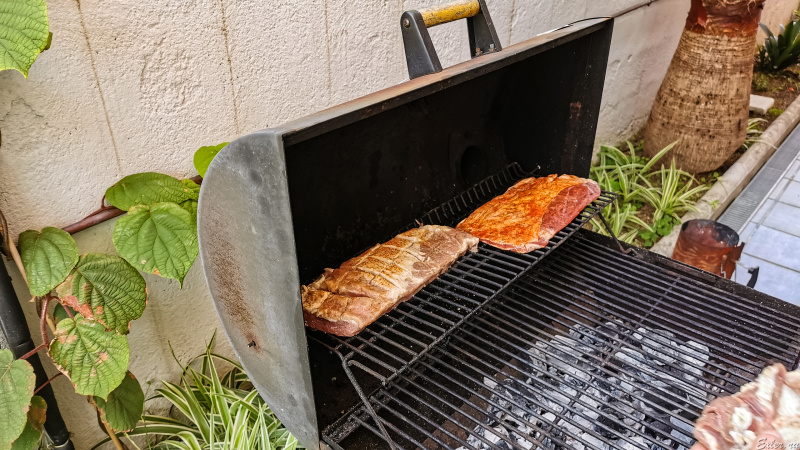 Так-же долгое время готовки дает шанс подкоптить - делаются пакетики из фольги для щепок или кусков дерева и меняются каждые 30 мин.