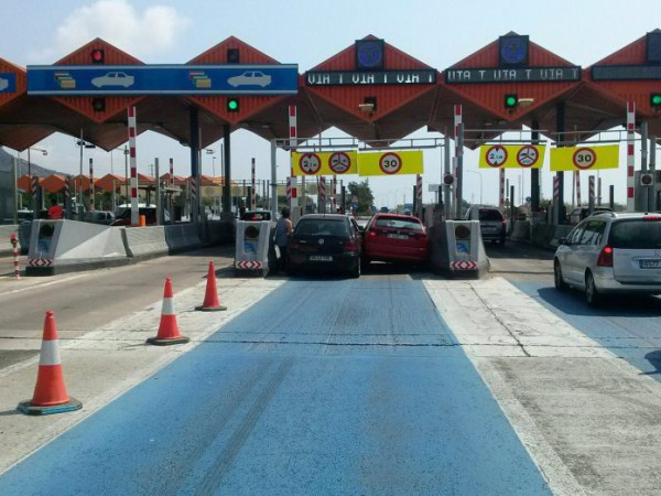 В нашей городской рассылке ржут над двумя дебилами, которые сумели не поделить пункт оплаты автострады и въехали туда одновременно. Как вообще можно было ухитриться такое сотворить - не очень понятно. Но по фото похоже, что мужик в красной машине - выдающийся феномен.