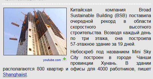 Алекс, там не совсем честно считаются сроки постройки. Это модульные домики. По сути стены, потолки и все коммуникации в них (трубы и проводка) собираются заранее на заводе, а на месте стройки данные готовые панели только собираются в единую конструкцию. Т.е. сама стройка - это уже заключительный этап, не самый сложный и не самый долгий. Что впрочем не уменьшает заслуг китайцев. Все равно они молодцы. Вот собственно запись как они строили отель в 30-ть этажей за две недели - Он еще и сейсмоустойчивый ко всему прочему. Чудеса просто.