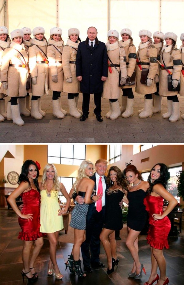В этих двух фотографиях - вся суть. Президент курильщика и президент нормального человека. Наш - строен, подтянут, серьезен, имеет аккуратную стрижку, находится в обществе спортсменок, комсомолок и отличниц боевой и физической подготовки в валенках на каблуках. При взгляде на это фото сразу хочется отдать честь, прослушать политинформацию и пробежать нормы ГТО.
