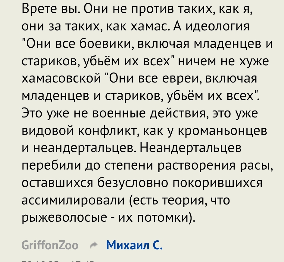 • Война в стиле "убить всех этих выродков" (как сейчас разгоняет тупая израильская пропаганда и местные комментаторы) – таки ни хрена не решит суть проблемы. Напротив – лишь усугубит проблему ещё сильнее и глубже, появится гораздо больше "мстителей в духе око-за-око".
