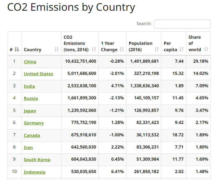 Снизить выбросы в 1,4-миллиардном Китае намного сложнее, чем в тех же 327-миллионных США. Посмотрите на предпоследний столбец.
