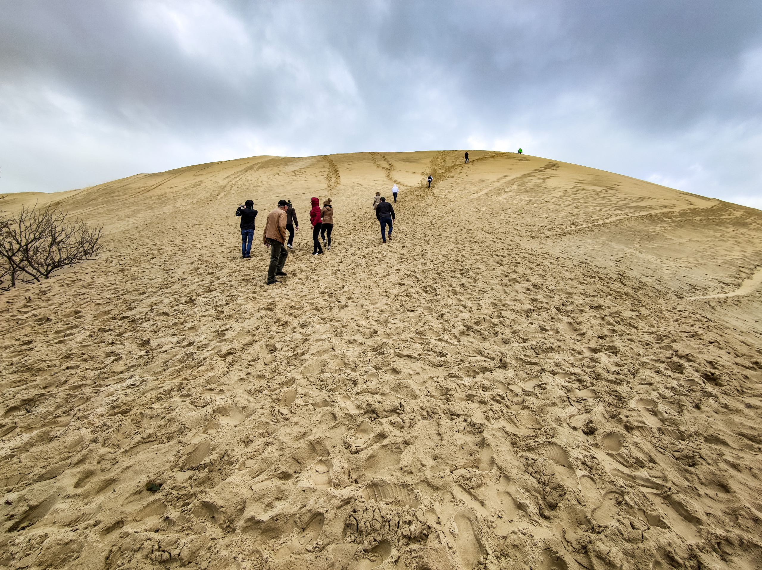 Летом тут, конечно, совсем другое дело. Ветер очень несильный, а для туристов еще и прокладывают лестницу в 260 ступеней. Туристы поднимаются наверх босиком (песок забьется в любую обувь) и потом там гуляют по трехкилометровой зоне дюны.