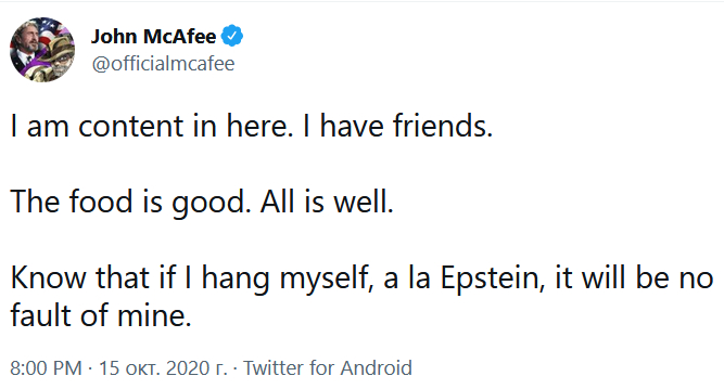 За полгода до своей смерти Джон МакАфи написал в своем Твиттере, что он не собирается оканчивать жизнь самоубийством, и что если подобное произойдет, то это будет насильственная смерть.