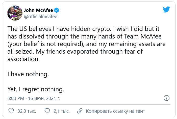 "В США считают, что я припрятал криптовалюту. Я был бы не прочь, но мои средства растворились, пройдя через многие руки в команде McAfee (вам необязательно этому верить). А все остававшиеся у меня активы арестованы. Мои друзья испарились, не желая оказаться в числе соучастников. У меня ничего нет. Но я и не жалею ни о чем".
