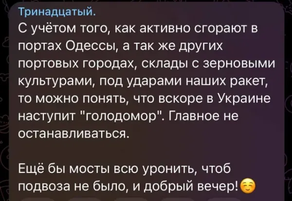 Как выяснилось, террористические акты готовились в одном из агропредприятий Одесской области. В этой подготовке участвовали 100 тонн гороха и 20 тонн ячменя, которые и были благополучно уничтожены "Калибрами".
